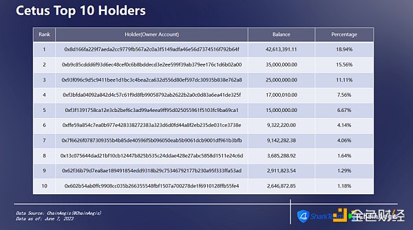 CETUS的持币者地址数达到13,397,Top 10持币者的持币量为162,321,888.80 CETUS,占CETUS总量的72%。其中Top 1地址0x8d16...b64f的持有量为42,613,391.11 CETUS,占CETUS总量的18.94%。Top 2地址占比15.56%,Top3地址占比11.11%,前3个地址的占比均超过10%,总占比达到45.6%。