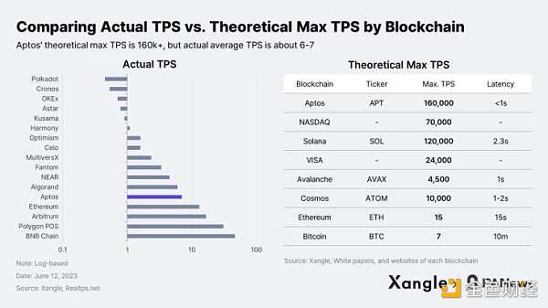 无需许可的公共区块链的一大挑战是可扩展性。可扩展性主要与区块链的处理速度相关,通常通过吞吐量和延迟来衡量。目前,Aptos 区块空间的实际需求相对较低,平均为 6-7 TPS,不过该技术理论上能够实现 100,000+ TPS 和亚秒级延迟。考虑到 VISA 和 Mastercard 每秒处理大约3000到4000笔交易,这无疑是一个令人印象深刻的数字。Aptos能够实现如此高的可扩展性很大程度上归功于Quorom Store(Narwhal)、State Delta Synchronization、Jellyfish Merkle Tree(JMT)等技术的采用。其核心在于其自己的共识机制(AptosBFT v4)和并行处理引擎(BlockSTM)。