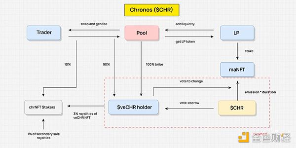 它改进了协议费用的分配方法,用户只能享受所投票的池产生的交易费用,鼓励用户为流动性最强的池投票。 基于 Olympus 的经典 rebasing 机制,后来的项目如 Velodrome 降低了对 ve 代币 holder 的增发奖励比率,而 Chronos 则完全取消了 rebasing 机制。
