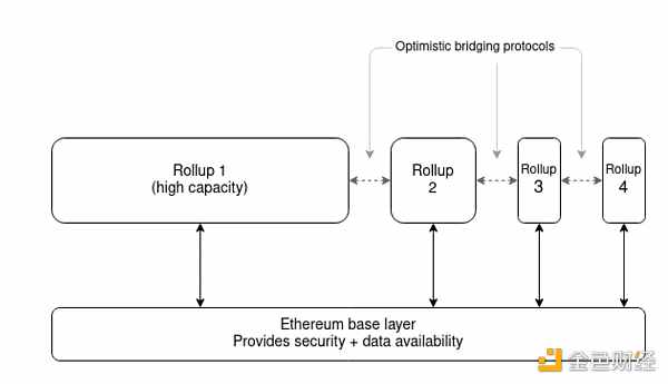 同样的系统设计逻辑也是以太坊在 Rollup-centric 路线图中,在逐步将交易可拓展性放到各类 Rollup 的 L2 的设计思想,并在继续解耦数据可用性 (Data Availablility) 等,这也给了大量 L2 和 DA 项目的诞生空间。