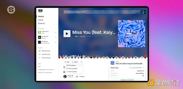 在 Sound.xyz上,歌曲免费播放,用户可以策划自己的播放列表。艺术家可以将歌曲与一系列限量版 NFT 一起展示,听众可以直接从创作者那里收集并对他们拥有的歌曲发表公开评论。