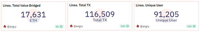 目前Linea跨链桥锁定17,631 ETH(价值约3,300万美元),链上交易笔数11.7万,独立用户数9.1万。
