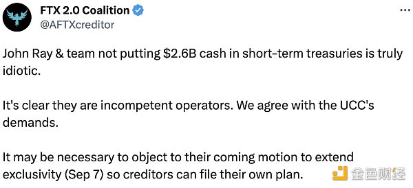 而 FTX 2.0 债权人联盟今日也发表评论称,无担保债权人官方委员会(UCC)应选择运营 FTX 2.0 团队,同时要求重启和恢复代币,并对其 26 亿美元的现金持有量收取利息。从 John Ray 及其团队未将这笔资金投入短期国债的决策来看,他们是无能的运营者,可能有必要反对他们即将提出的延长独家权利的动议,以便债权人可以提交自己的计划。