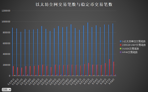 另一方面,我们也整理了近期以上三种稳定币在以太坊上交易笔数,同样得出一些有趣的结论。