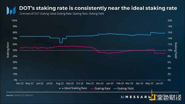 截至第二季度末,Polkadot 的质押率为 46%。 这表明质押的 DOT 数量低于理想的质押率,从而触发了质押奖励的增加。 按照目前的质押率,DOT 质押者的年质押收益率为 16%,实际收益率为 9%。