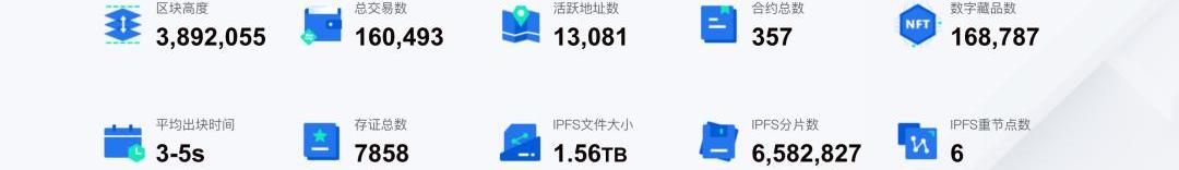第二个版块展示了海峡链的链上关键数据统计结果,包括:海峡链的“区块高度”,发送的“总交易数”,链上“活跃地址数”,运行的“合约总数”,链上的“数字藏品数”和“存证总数”,还有“IPFS文件大小”、“IPFS分片数”、“IPFS重节点数”等信息。