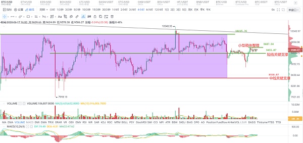 建议短期可重点关注9700一线阻力,可将该价位视作短期多空分界线,不破则空头格局延续,不贸然加仓或新开仓买入,若在4小时或以上周期图表中可看到明显放量上破,则有望再去测试10200阻力区,甚至再创新高。那么就需要密切留意是否出现对9700一线的放量突破(打开4小时图,可以达到或者超过6月15日的最大量即可算放量)。
