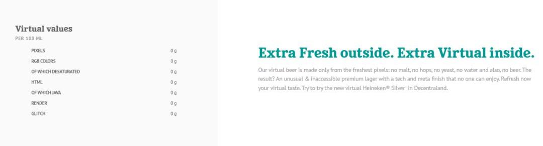 为了增加消费者对于虚拟啤酒更为沉浸式的体验,相较于传统啤酒通常会在包装上标明营养成份表,喜力在其官方网站上清晰提供了数字啤酒的“虚拟价值”,其中包含像素、HTML、RGB颜色、渲染、故障等。