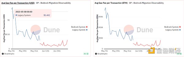此外,在网络性能方面,Optimism 也一直在优化提升。今年 6 月份,Optimism 宣布完成主网 Bedrock 升级,进一步降低交易费用、缩短存款确认时间,提升了性能。根据 Dune 数据显示,自完成 Bedrock 升级后,Optimism 平均每笔交易 Gas 费用下降了大约 75%,其中 Optimism 主网成为 Token 兑换中最便宜的以太坊 L2 网络,现每笔交易 Gas 费约 0.1 美元。