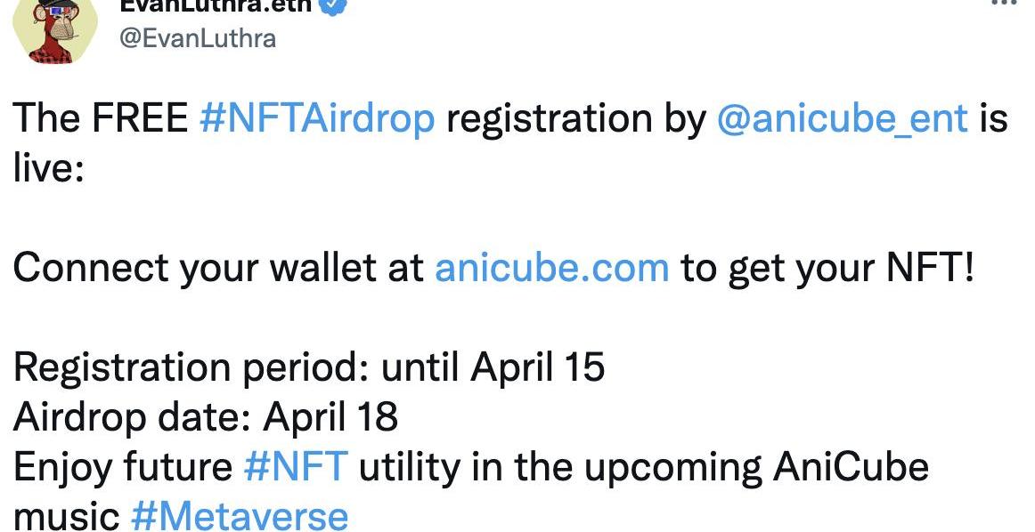 DeFi之道讯,4月11日,天使投资人EvanLuthra.eth发推称,AniCube已开放免费NFT空投注册,注册截至4月15日。空投将于4月18日开启。