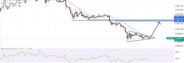 如果它能够突破三角旗结构的北部及其21日均线,则有可能迅速恢复至0.0001160美元区域的支撑转阻力位,比当前水平高出约36%。