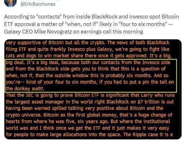 他继续补充:“这可能需要4至6个月的时间,美国证监会(SEC)才会批准比特币现货ETF。”