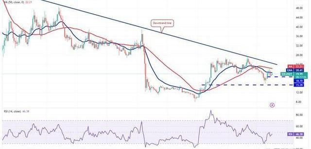 救济反弹已经到达移动平均线,这可能会提供强大的阻力。如果价格下跌并跌破18.70美元,则表明SOL/USDT货币对可能会在50天均线和15.28美元之间维持一段时间的区间波动。