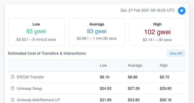 如下图所示,来自于Etherscan的数据显示,当前正常速度下,一笔ERC20代币转账,需要花费9美元左右,相当于一份肯德基全家桶。而在Uniswap上进行一笔交易,则需要花费27美元左右,可以买四个十寸的苏丹王榴莲披萨了。