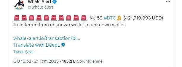 来自鲸鱼研究平台WhaleAlert的新数据显示,一位高净值投资者以一种引人注目的方式将价值4.217亿美元的14,159个比特币(BTC)从一个未知钱包转移到另一个钱包。