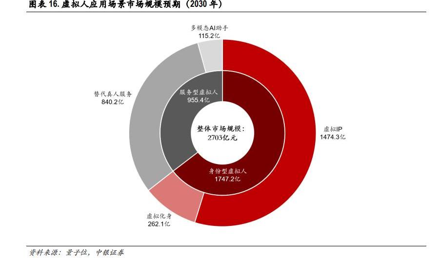 应用场景与虚拟人类型密不可分,功能型与身份型是当前虚拟人应用中最根本的两个类别。功能型虚拟人作为现实职能的替代,应用于标准化内容生产中。根据内容生产的灵活性,又有非实时交互与实时交互之分。功能型虚拟人主要以替代人工生产,提高效率为目的。身份型虚拟人则是超越“替代”,拥有独立身份,被赋予个性的人格特征,参与现实生活中的娱乐和社交,以创造经济收益。其又可细分为虚拟偶像类、虚拟角色类、虚拟化身类三种。量子位研究预测到2030年,功能型虚拟人的市场规模将达到955.4亿人民币,占虚拟人整体市场规模的35.4%。