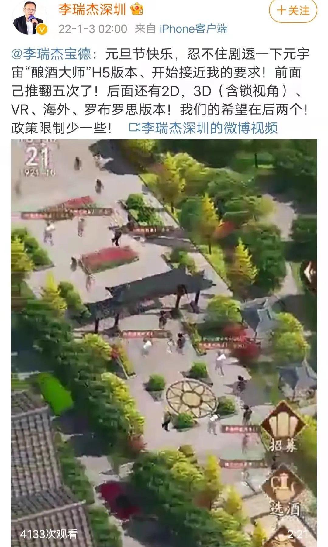 年初的1月3日,中青宝董事长李瑞杰在微博上发布了一则视频,这是其第一次为旗下的“元宇宙游戏”——《慎初烧坊—酿酒大师》做宣传。按照他的话来说,“开始接近我的要求!前面已推翻五次!后面还有2D、3D、VR、海外、罗布乐思版本!”