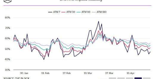 根据平价(ATM)期权定价,以隐含波动率形式衡量比特币波动率预期的替代指标也徘徊在近期低点附近。