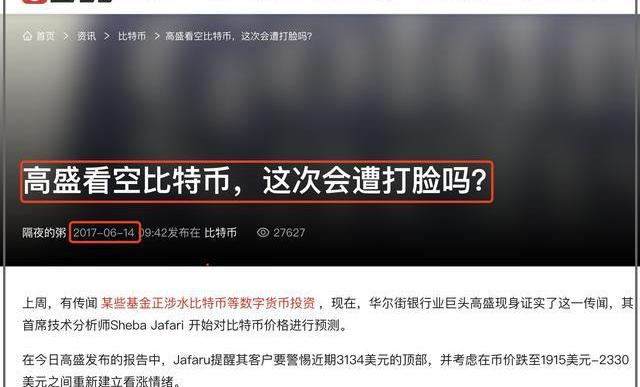时间回到2017年6月,高盛认为3134美元是比特币的一个顶部,结果之后半年内,比特币开启狂奔模式,一路涨到2万美金。