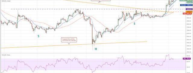 BTCUSD日线图,来源:Tradingview两个移动均线都在上升,相对强度指数处于超买区域,这表明多头处于主导地位。