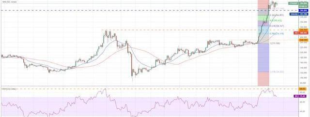 如果多头可以将价格推高至下降趋势线上方,则将向多头发出信号。在此阻力之上,可能反弹至353美元。突破该水平可能会将上升趋势恢复至400美元。