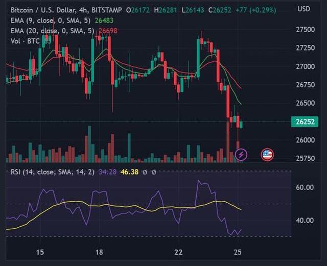 截至发稿时,根据CoinMarketCap的数据,BTC的价格仍低于关键的27,000美元大关,在前24小时内下跌1.85%后,交易价格为26,252.95美元。vandePoppe讨论的第一个潜在情景似乎在过去一天出现了,因为BTC的价格创下24小时低点25,890.59美元。