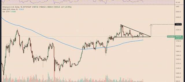 从技术角度来看,以太币的价格反弹发生在构成下降三角形形态的短期支撑位附近。