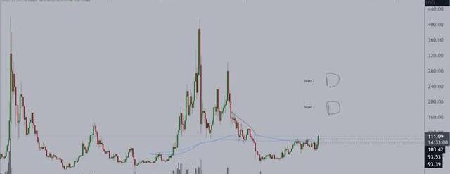 目前价格为111.78美元,24小时涨幅为+1.89%。价格突破200周均线和均线,并突破100美元阻力位,形成年度新高。预计价格最初将突破180美元,并进一步创出200美元以上的新高。