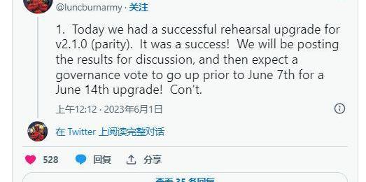 “今天我们对v2.1.0进行了成功的预演升级。这是成功的!我们将发布结果进行讨论,然后预计在6月7日之前进行治理投票,以便在6月14日进行升级!