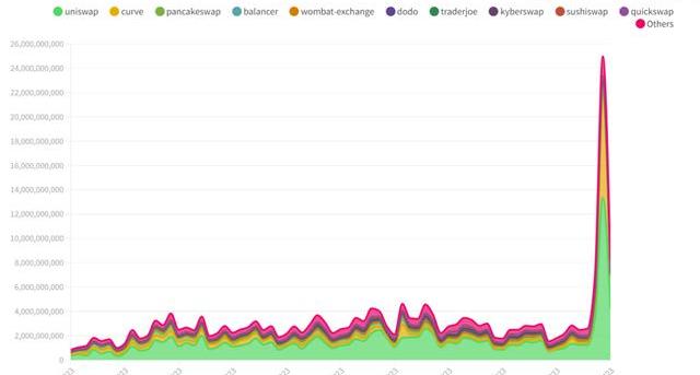 在本周早些时候出现的稳定币危机期间,去中心化交易所(DEX)的交易量大幅飙升,市值第二大稳定币USDC在回升前跌至0.87美元的低点,