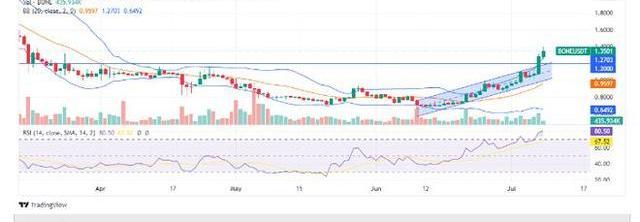 BONE价格突破多个阻力位和上升通道,触及1.4美元的24小时高点。这表明价格走势看涨,布林带和RSI表明在持续走强的情况下将出现更多上行趋势。由此产生的反弹可能会使BONE价格在几周内上涨至2美元,在Shibarium发布后上涨至3美元。