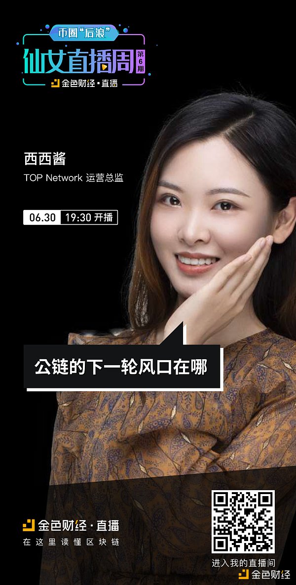 本期行业7位“后浪”仙女带你走进区块链世界,她们分别来自头部资本、优质技术社区、自媒体、公链以及区块链公司。在区块链纳入新基建范围的大环境下,应如何更好促进行业发展?每晚20:00,相约金色财经直播间!本周“后浪”仙女直播主题具体如下: