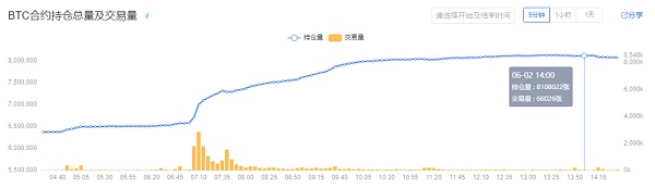 根据OKEx合约大数据显示,今日小时级别合约多空持仓人数比涨至近3个月以来新高1.8,持仓量持续增加,达到810万张以上。