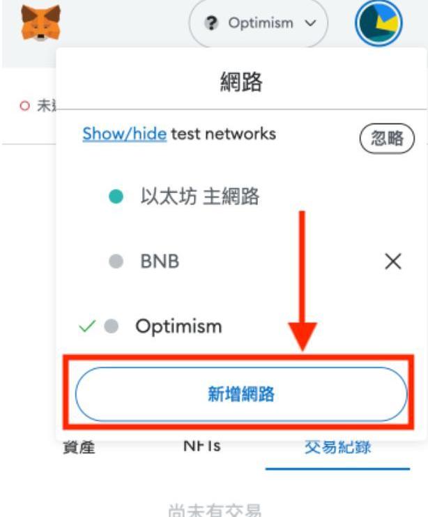 如果你之前从未在MetaMask上添加过该区块链,可点击钱包首页的「新增网路」后,透过搜寻Optimism或自行新增的方式,在钱包中添加该区块链。