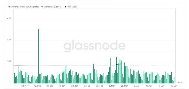 从购买力数据来看,BTC在上升超过27,000美金以后并没有带动更大的成交量,所以必然购买力的情况也不够乐观,截止到今天早晨八点USDT转移到交易所的资金量大幅低于上周均值,不到五亿美金的资金量几乎是最近半年的吊车尾,这也代表了虽然USDT的市值在持续上升,但购买力却没有明显的提升,更多的资金很有可能是不看好短期价格的走势,而选择观望。而USDC却完全相反,虽然市值一直在被打压降低,但周一的购买力还是超过了上周的均值,达到了7亿美金转移到交易所的数量。果然就像是彭博社统计的一样,在预测到危机的时候确实有不少美国人将BTC视为避险资产。