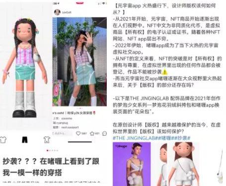 被认为可圈可点的人物形象和画风,也被多方质疑“虚拟穿搭抄袭”。有博主表示,啫喱中出现了和自己过去笔记中一模一样的穿搭。也有配饰品牌发文表示,在啫喱里看到了和去年自己品牌创作的一款斜挎包非常相似的花朵包。