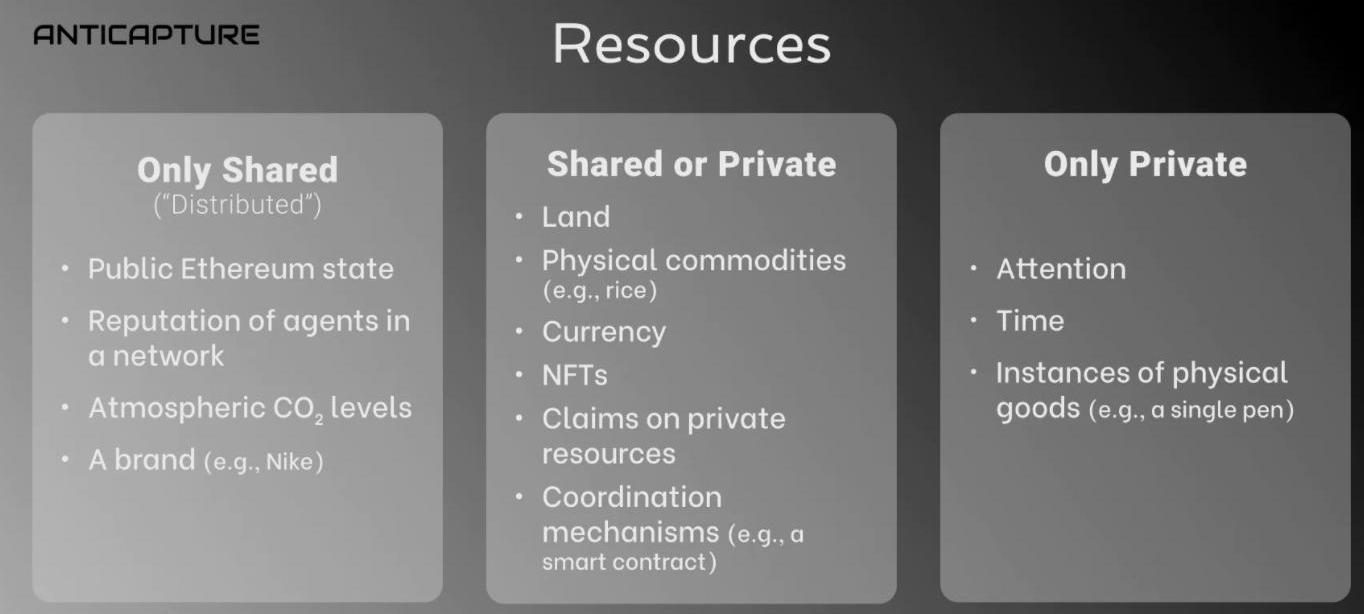 上句中的第一级资源往往是协调机制或治理结构。虽然在日常讨论中这些通常根本不被视为资源,但反捕获框架将它们视为这样,因为代理采取的行为会影响它们,并且它们可以被捕获。