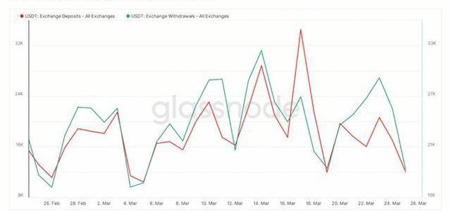 另一方面,USDT的流动更为明显。看看过去两周的USDT流量就会发现,USDT交易所存款在3月17日达到顶峰,也就是USDC失去挂钩几天后。这表明从USDC到USDT的流动性强劲。