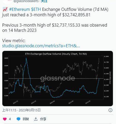 最新的ETH交易所流量数据证实,交易所流出量正在回升。由于过去几天观察到强劲的购买压力,在此期间其价格走势强劲反弹。