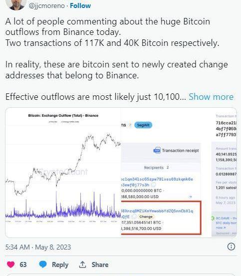 CryptoQuant的研究主管JulioMoreno在5月8日的一条推文中透露,人们正在评论Binance的大量比特币流出。周日17k和40kBTC等交易记录从Binance到其他钱包。