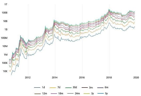 下图为不同持有期限的币天销毁情况,低则持有1天、7天,高则持有3年、5年不等。短期持有代表需求;长期持有代表供应,从图中可以看出,每一轮币价的增长都由新的囤币需求在推动。