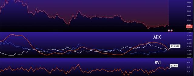 上图还显示了另一个技术指标——相对波动率指数(RVI)。该指标衡量特定时期内资产价格变动的波动性。关于图表数据,格林威治标准时间的RVI位于50以上,表明波动性很大。