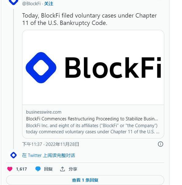 Billions项目组主要的加密借贷和抵押平台BlockFi于周一正式申请破产。BlockFi成为SamBankman-Fried的FTX丑闻引发的金融风暴的最新因果关系。