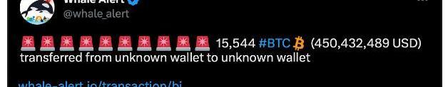 根据WhaleAlert分享的数据,周三,一个未知地址将15,544BTC转移到另一个未知地址,按当前价格平均价值4.5亿美元。