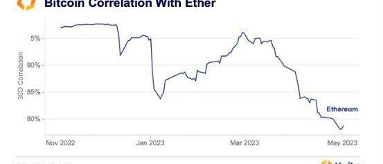根据Kaiko的说法,本周比特币与以太币的30天滚动相关性自2021年11月以来首次跌破80%。