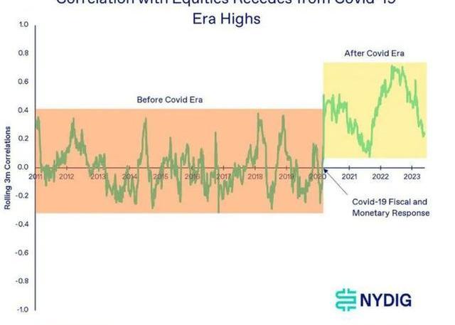 NYDIG最近的一份研究报告表明,比特币与股票市场的相关性已从Covid时代的峰值大幅下降。如下图所示,在大流行前的时代,比特币并不强烈依赖股票或其他主要资产类别。然而,随着全球央行和监管机构在大流行期间采取货币和财政刺激措施,相关性开始上升。