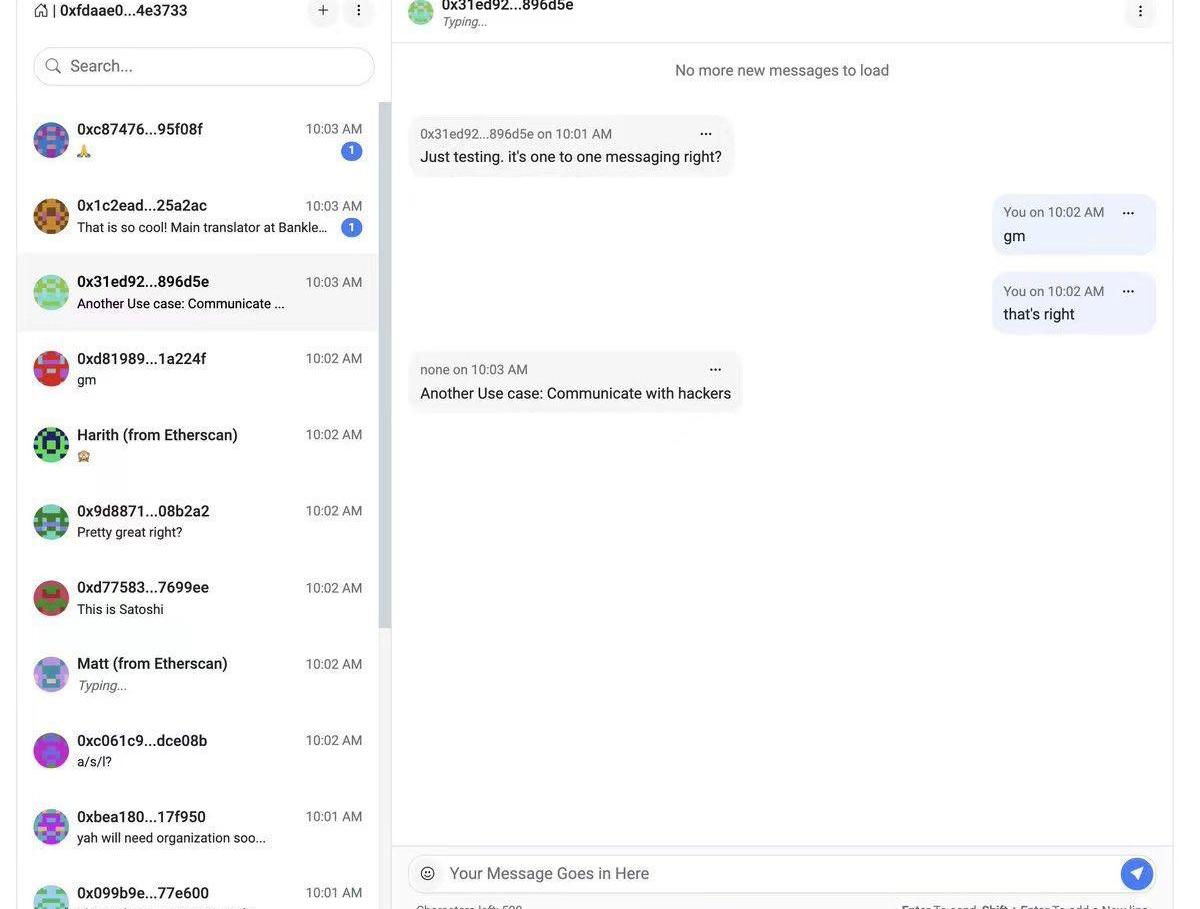 实际上,Etherscan此前在链上通讯方面亦有相关探索。去年10月,Etherscan推出EthereumIDM功能,将以太坊交易中的附带的InputData备注功能开发一个可视化页面,用户不仅可以直观查看特定地址的相关InputData历史记录,也可以便捷地向该地址发送InputData消息。