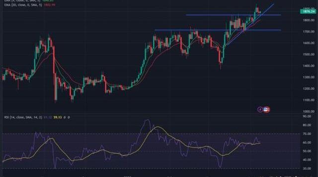 根据CoinMarketCap的数据,截至发稿时,ETH的价格在24小时上涨0.42%后为1,876.17美元。这增加了领先的山寨币本已积极的每周价格走势——使过去7天的总收益达到+2.79%。