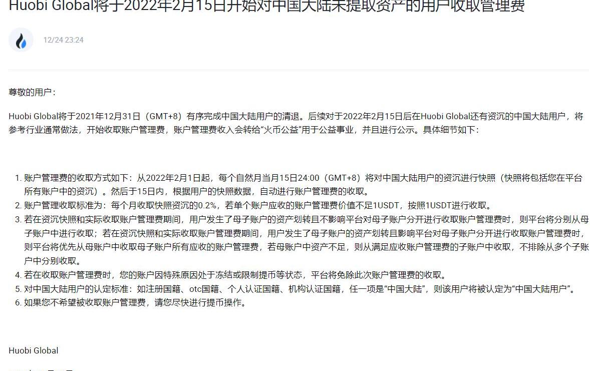 巴比特讯,12月24日,HuobiGlobal发布官方公告,宣布将于2021年12月31日有序完成用户的清退。后续对于2022年2月15日后在HuobiGlobal还有资沉的用户,将参考行业通常做法,开始收取账户管理费,账户管理费收入会转给“火币公益”用于公益事业,并且进行公示。