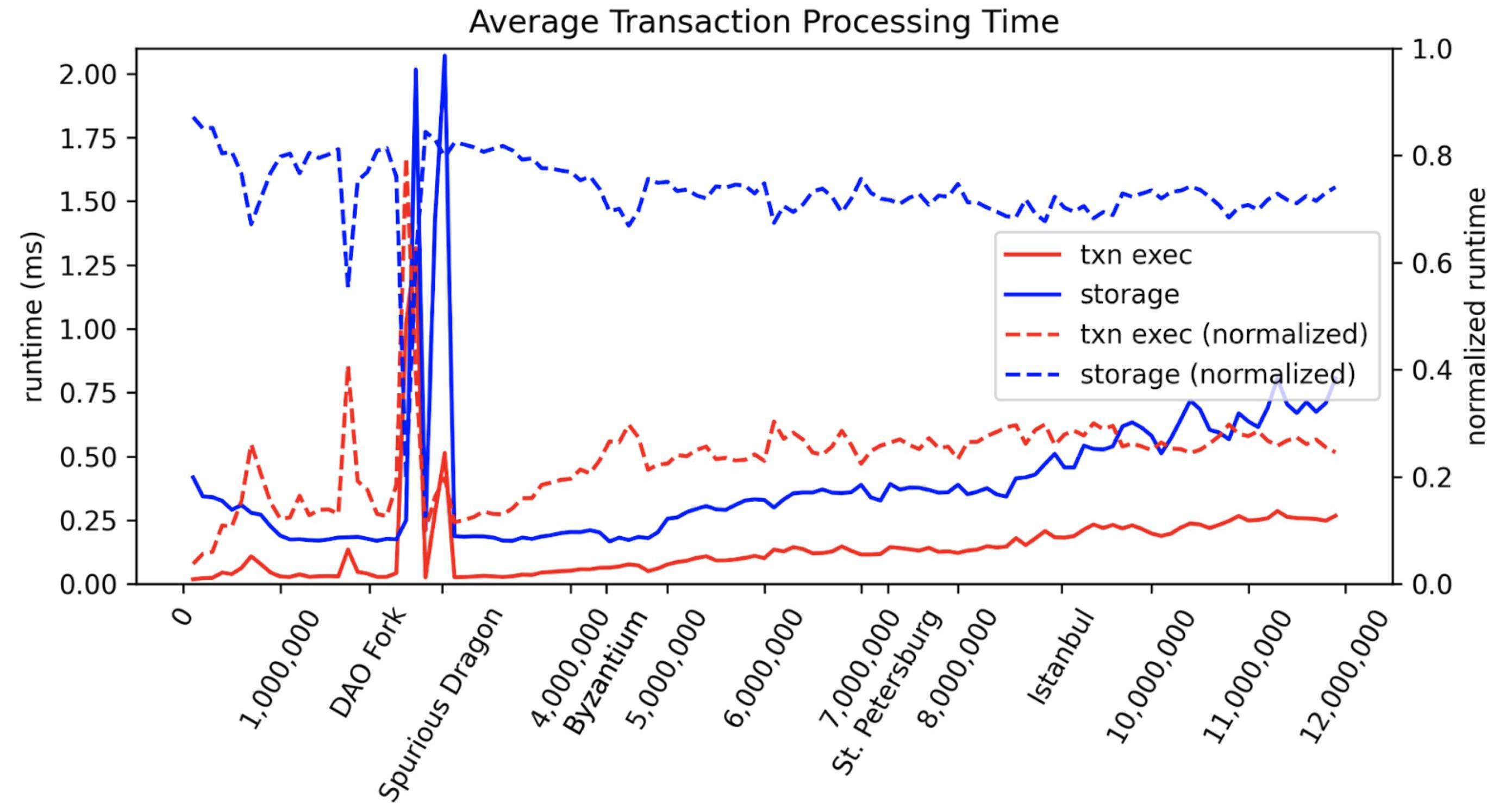 对于节点性能,EVM存储维护是一大瓶颈,目前占用了超过70%的事务处理时间。而对于另外20%+的实际EVM指令解释时间,最耗时的操作码是SLOAD,因为在涉及IO访问的大型数据库中,Merkletrie节点的随机访问。